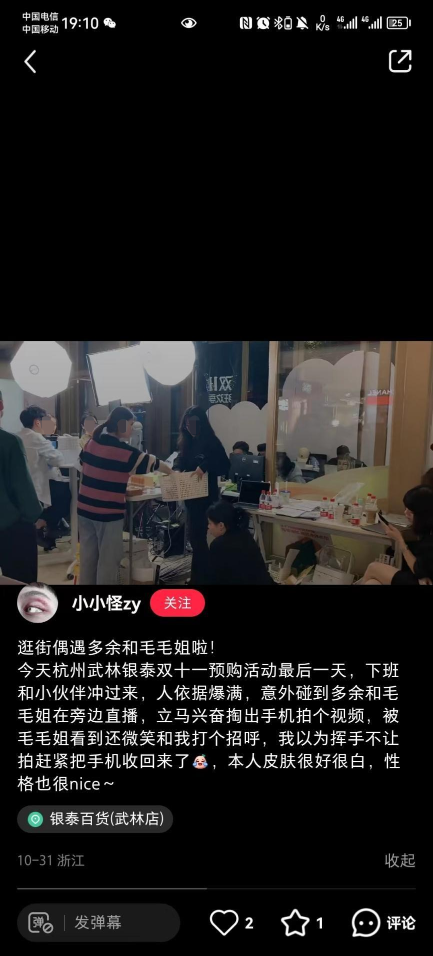 网友偶遇“毛毛姐”在银泰的双十一直播/小红书截图