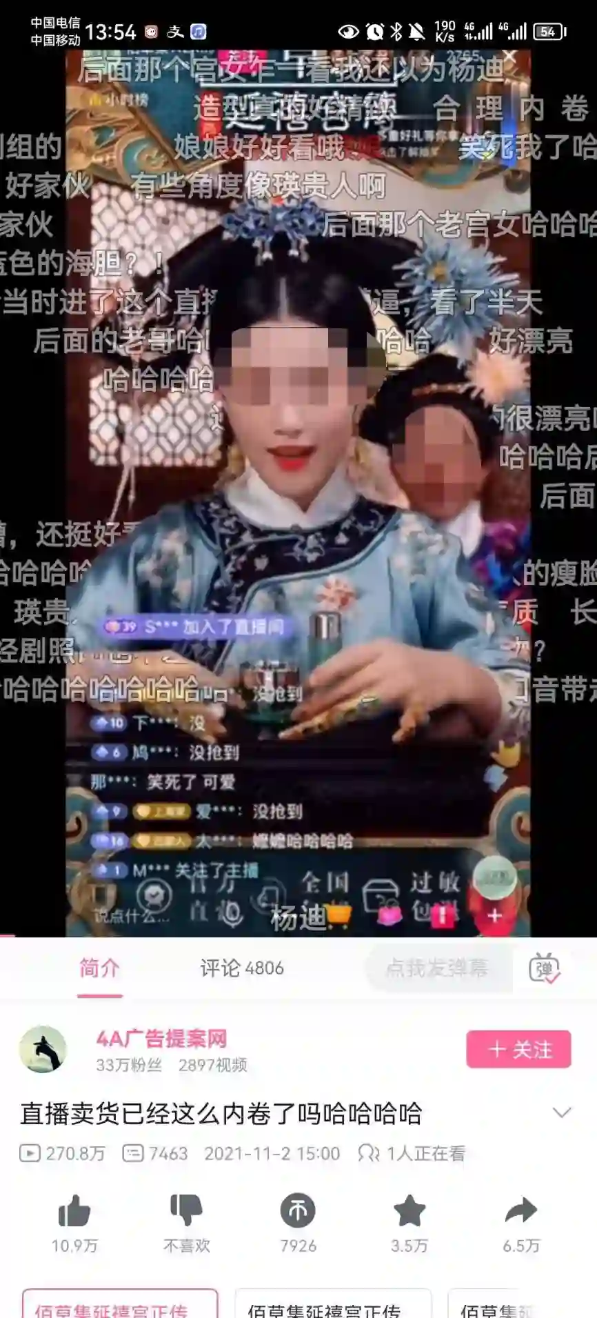 此前有某护肤品在直播间上演宫廷剧,要妆发有妆发,要剧情有剧情,账号开播不到两周吸粉20万,相关的搬运视频在哔哩哔哩的播放量已经高达到了270万。