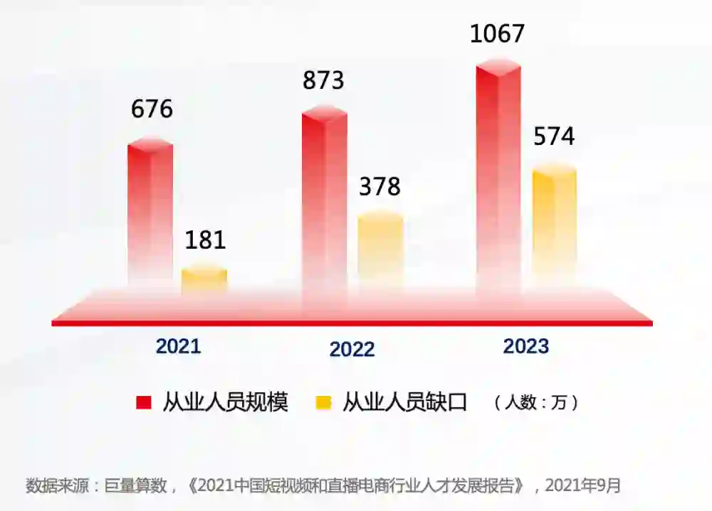 《2021中国短视频和直播电商行业人才发展报告》显示,2021年至2023年短视频和直播电商领域的从业人才缺口分别为181万人、378万人、574万人,需求逐渐增长。其中,对网络主播的需求量占比超过45%。