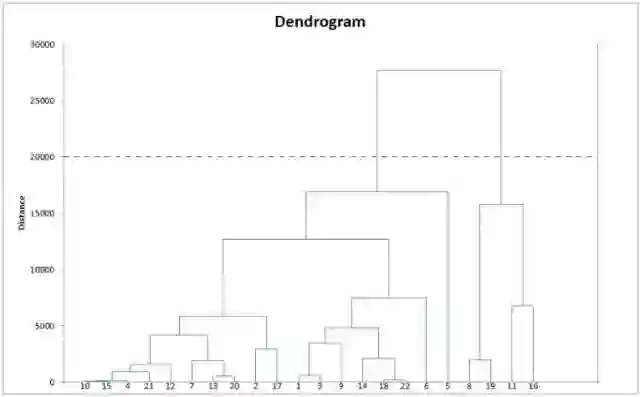 选择一个聚类数量,然后在这个树状图中划一条水平线。比如说,如果你想要 K=2 个聚类,你应该在距离大约为 20000 的位置画一条水平线,你会得到一个包含数据点 8、9、11、16 的聚类和包含其它数据点的另一个聚类。一般而言,你得到的聚类的数量就是水平线与树状图中的竖直线的交叉点的数量。