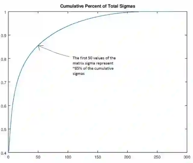 首先,我们发现如果我们根据大小排序这些奇异值(矩阵 Σ 的值),那么前 50 个奇异值将包含整个矩阵 Σ 的大小的 85%。