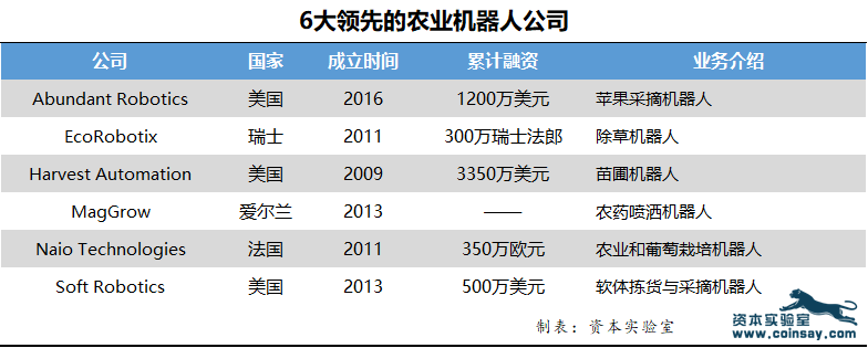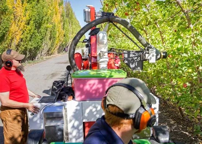 Abundant Robotics公司的主打产品是一款苹果采摘机器人。不同于传统农业机械设备用机械爪进行水果采摘,易对水果造成损伤,该机器人通过机器视觉技术可以准确识别树上已成熟的苹果,并用类似真空吸尘器的机械前端,将苹果从树上吸下来,从而避免损伤苹果和果树。
