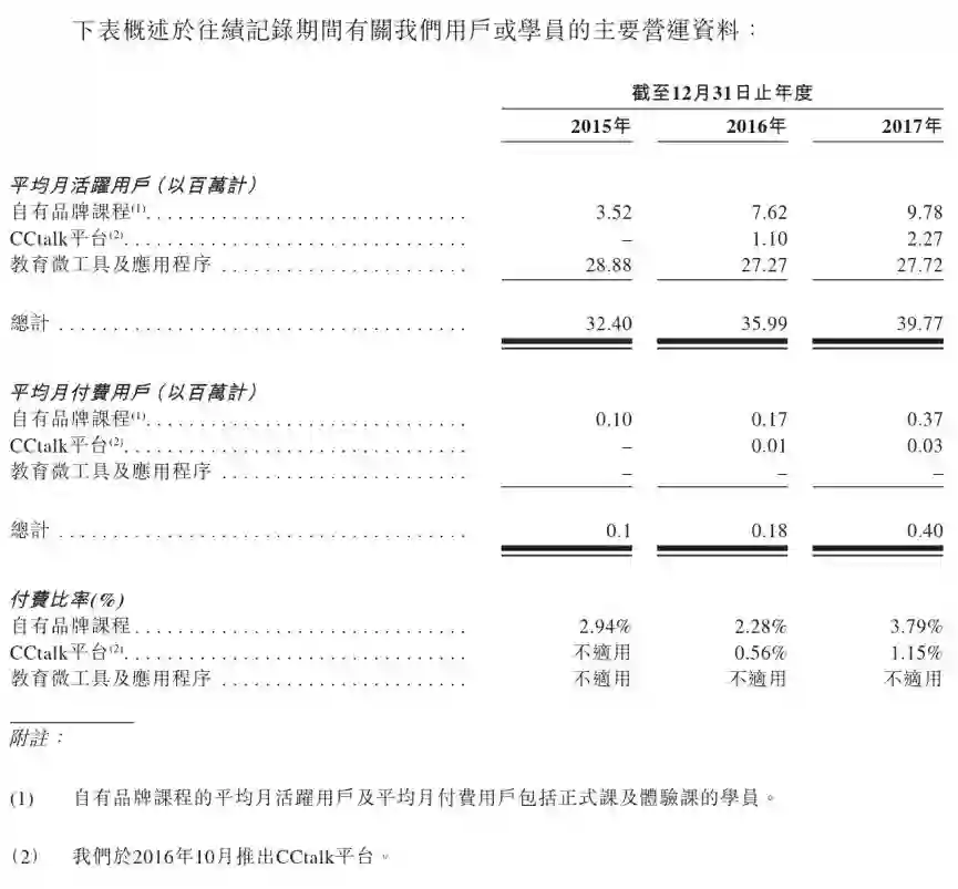 在第三方教育从业者方面,截至2017年12月31日,共有2187家商户和41534名自雇网师在CCtalk平台上注册,这一数字在2016年12月31日时,分别为992和11,831。课程数量也从2016年底的37,707门增长至2017年底的73,795门。