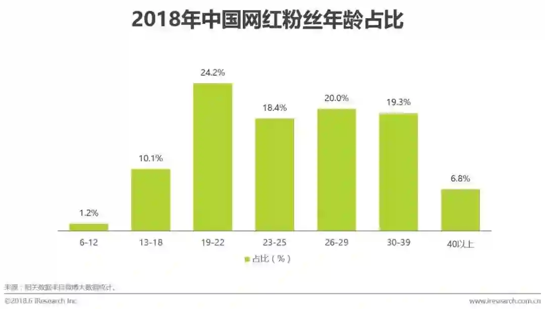 相较于网红年龄的成熟化,网红粉丝的年龄构成明显趋于年轻化,与网红的年龄分布相比,粉丝群体中80、90后所占的比重几乎相等,总体占比在80%以上。