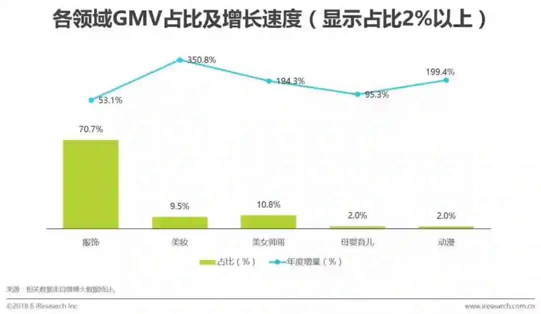 随着网红经济产业的不断发展完善,各式变现方式也层出不穷,而电商作为传统变现手段之一,在去年的表现仍旧十分亮眼。据统计,截至2018年4月网红电商GMV年度增长量高达62%。在各细分领域之中,服饰类作为龙头,其GMV占总规模超过70%。