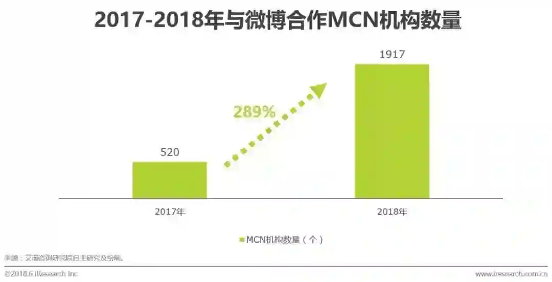 lMCN机构与平台之间的合作日益紧密。平台通过对机构进行扶植与帮助,为其提供更多的流量以及更高效的宣发渠道,使机构可以将更多的精力放在内容的产出上,提高了内容质量。同时优秀的内容也会为平台带来了更多的用户,形成良性循环。截止2018年,与微博合作的MCN机构数量达到1917家,较去年增长269%。合作覆盖领域达53个。