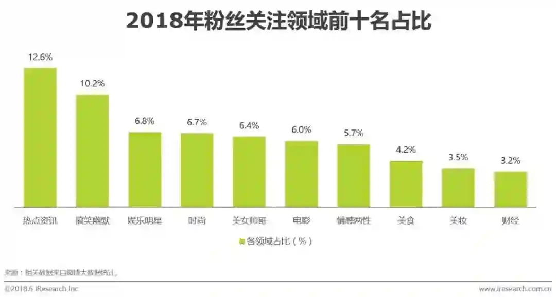 在粉丝关注的领域中,热点资讯方面的内容更能吸引人们的注意,而同时娱乐类领域的总体关注度依然处于领先位置。关注度前五名中有三名与娱乐相关,分别是搞笑幽默、娱乐明星和帅哥美女,三者占比总和达到了23.4%。
