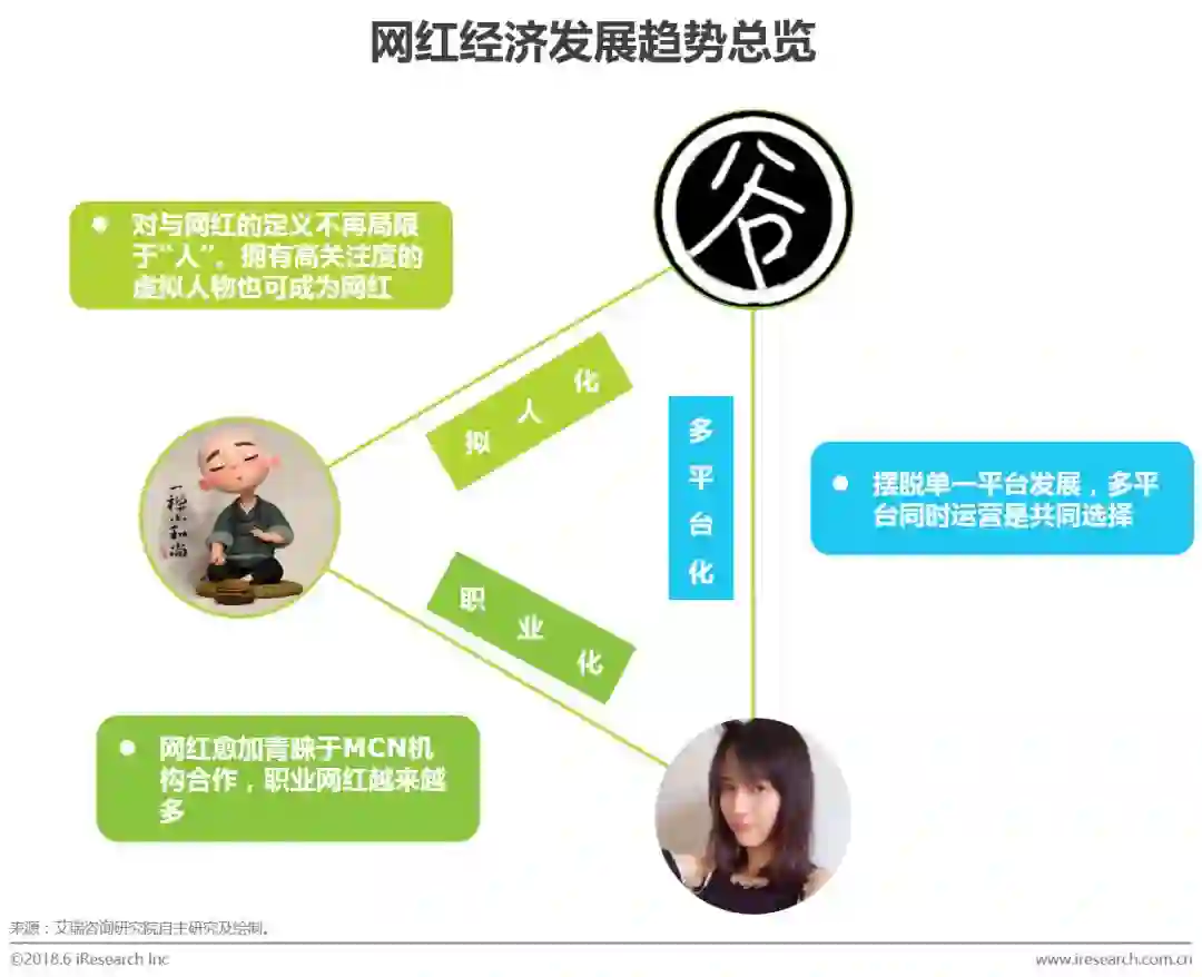 2018年网红粉丝趋于年轻化,位置遍布全球。网红领域逐渐多元化,内容逐步多样化,新领域、新内容崛起。MCN机构成为网红经济产业链核心,规模发展迅速,网红经济产业链条逐渐稳定,商业模式逐渐清晰,不同MCN机构根据自身特有属性探索独特的商业变现模式。网红产业逐渐向虚拟化、职业化、多平台化发展。