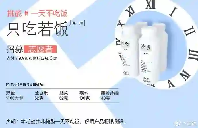 「一天不吃饭」是若饭在微博上发起的一次挑战活动,用于产品的极限测评——如果不是按照建议的食用方式用它代掉一天中的某一餐,而是一天只靠若饭维持能量,那么会怎样。