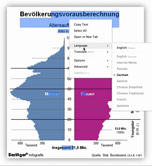 OCR需要知道图片中的语言才能正确识别文本,Naptha使用的是一种称为“ 笔划宽度变换”的算法,该算法由微软研究院于2008年提出,它就像人一样,即使不知道是何种语言,也能猜到文字就在那里。