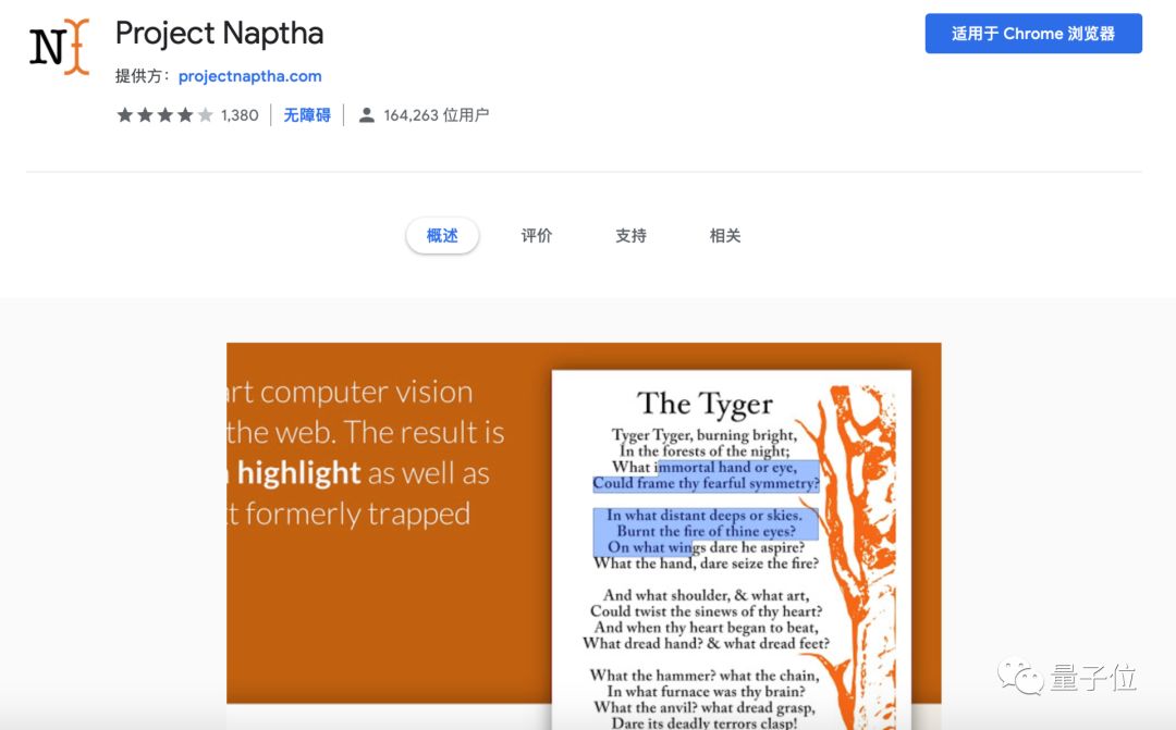 Naptha无需在电脑上安装App,直接在Chrome应用商店中搜索Project Naptha,就可以看到这款插件,一键安装后即可在Chrome浏览器中使用。