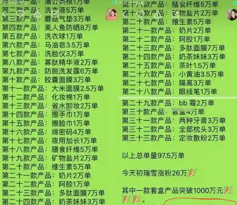 来自黑龙江的@辛巴818 常常以秒杀形式进行直播,曾经卖一款洗发水产品,3 分钟内 5 万单销售一空。