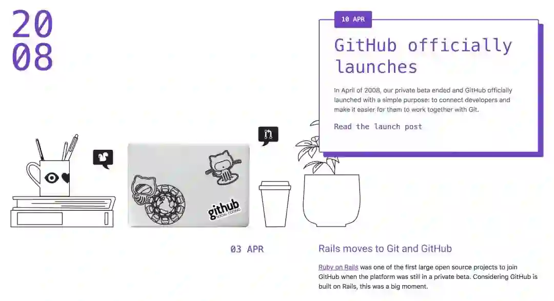 2008.4.3,Ruby on Rails在 GitHub 内测期间,将代码托管到GitHub上,成为第一个入驻 GitHub 的大型项目