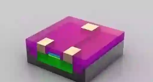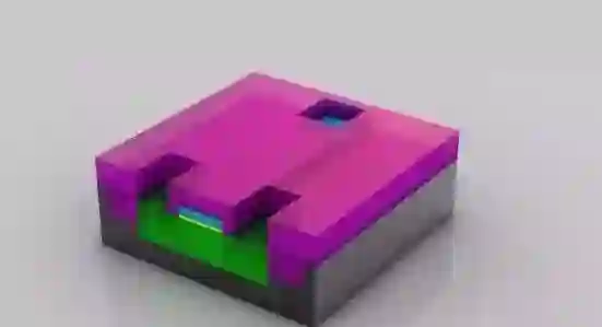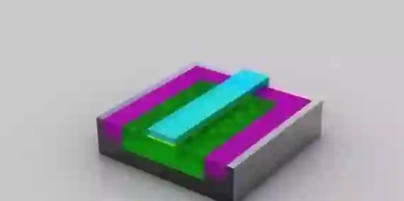 晶体管就绪:至此,晶体管已经基本完成。在绝缘材(品红色)上蚀刻出三个孔洞,并填充铜,以便和其它晶体管互连。