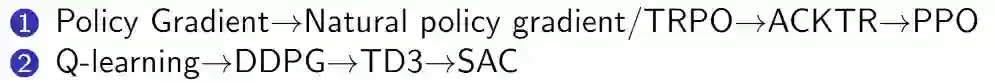 第六课依然是讲策略优化,不过难度上了一个台阶。在这堂课中,周老师主要介绍了策略梯度算法的不同变种以及近五年来最新的策略优化过程。其中,后者可以分为两条主线,涵盖强化学习中最有名的六种算法: