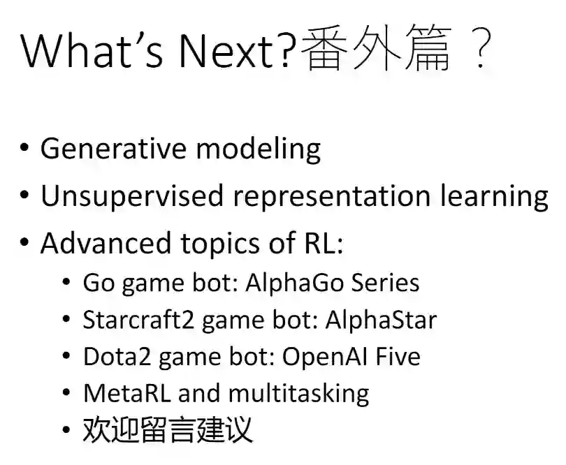 至此,《强化学习纲要》课程告一段落。不过,周老师表示,他可能会在暑假录一些「番外」,聊一聊自己感兴趣的生成建模、无监督表征学习等内容。此外,关于机器感知与决策的内容也在筹划,有望在暑假与大家见面。