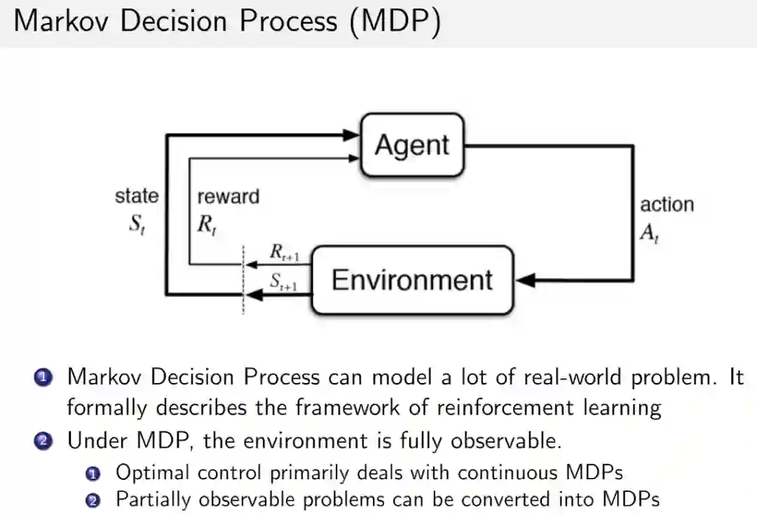 在第二节课上,周老师用 1 个小时的时间介绍了马尔科夫决策过程(MDP),包括 1)马尔科夫链(马尔科夫决策过程的简化版本)、马尔科夫奖励过程;2)马尔科夫决策过程的策略估计,即当给定一个决策过程之后,如何计算它的价值函数;3)马尔科夫决策过程的控制,包括策略迭代和价值迭代两种算法。