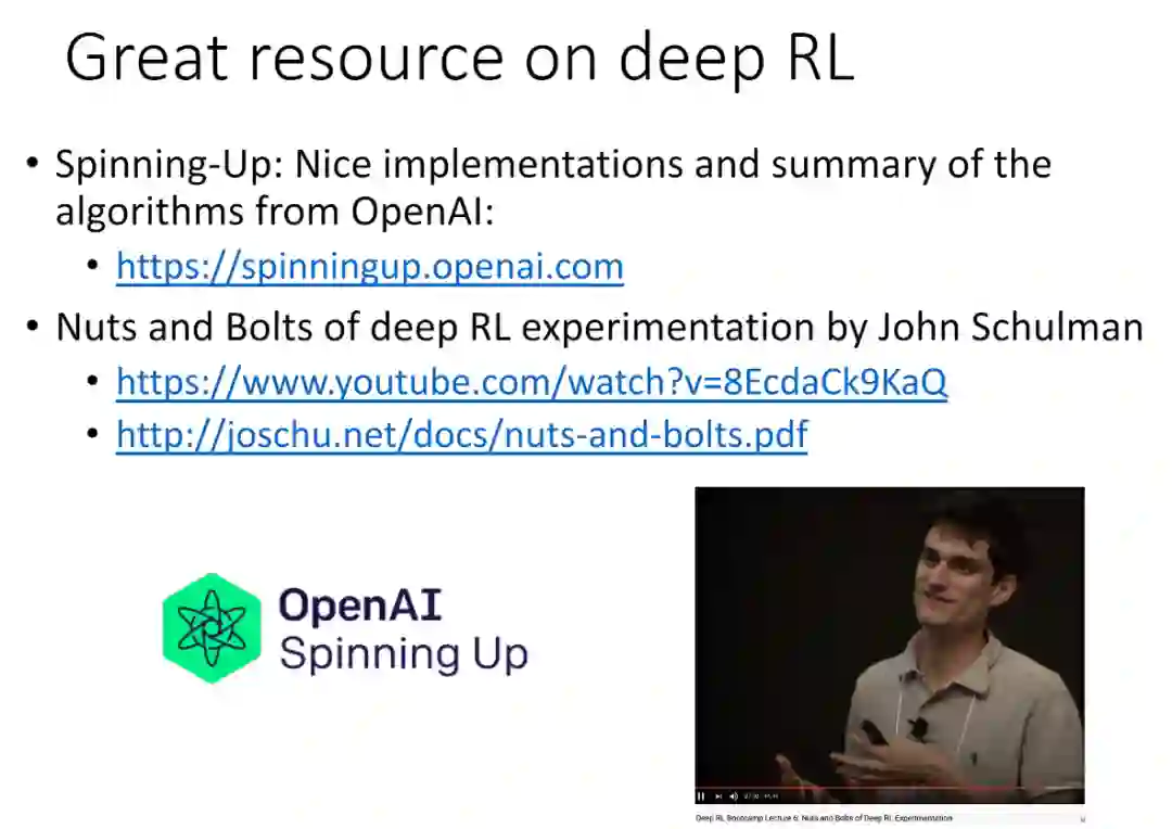 除此之外,周老师还推荐了一些强化学习方面的阅读材料,包括 OpenAI 的深度强化学习教程 Spinning-Up 和 John Schulman 的《Nuts and Bolts of Deep RL experimentation》课程。前者总结了现有的主流强化学习算法,既有代码也有讲解;后者是 John Schulman 的强化学习研究历程与经验。这些可以和本课程的推荐教材——Sutton 和 Barton 合作撰写的《强化学习》一起阅读。