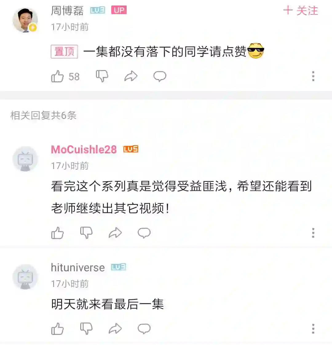 当然,由于课程比较难,大家难免有疑问。如果你在本课程学习期间遇到了问题,可以到 B 站视频的评论区留言,周老师会尽量作答,也会有热心的同学帮忙回答。