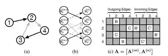 相比于GNN,GGNN的特点在于使用了门控单元来控制信息的传播,比如可以用GRU,LSTM等门控方式来传递图的信息而且,节点表示的更新次数被固定成了 。也就是说,GGNN并不能保证图的最终状态会到达不动点。由于更新次数