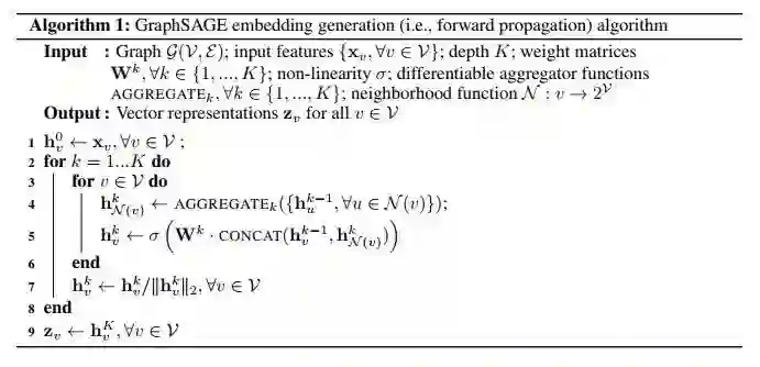 GraphSAGE框架的核心是如何聚合节点邻居特征信息来对当前节点特征进行更新,下文介绍GraphSAGE前向传播过程(生成节点embedding)和不同的聚合函数设定。