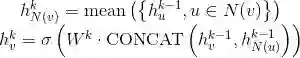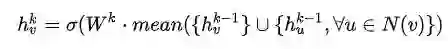 b. 归纳式聚合:直接对目标节点和所有邻居emebdding中每个维度取平均(替换伪代码中第5、6行),后再非线性转换: