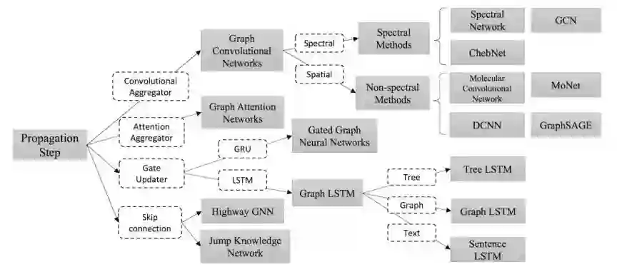 GNN根据传播方式也可以分为以下几类:图卷积神经网络GCN(Graph Convolution Networks)、基于注意力更新的图网络GAT(Graph Attention Networks)、基于门控的图网络(Gate Updater)、具有跳边的图网络(skip connection)。下文对这几种图神经网络进行概述。