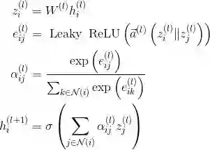 图注意力模型 GAT 用注意力机制替代了GCN中固定的标准化操作。以下公式定义了如何对第 l 层节点特征做更新得到第 l+1 层节点特征: