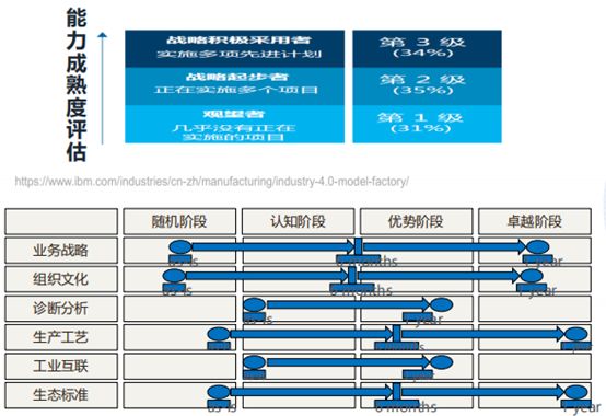 IBM智能制造能力成熟度评估的最终目标是希望强化两个转变:从关注局部向统筹全局转变,从强调技术向管理规范转变。根据IBM对全球相关制造企业做过的,类似两化融合管理体系的调研,整个调研数据显示:在三个月前调研的智能制造企业中,目前有31%的企业仍旧在观望之中,有35%的企业已经在做战略的起跑者,另外有34%的企业已经积极地采用智能制造的相关理念、技术管理,甚至全局统筹智能制造的相关技术与工具,走在智能制造的路上。