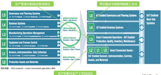 所以,从L2到L0,是指从生产控制到生产工艺的环节,这部分强调工艺的自动化。在L3生产管理的部分,则谈生产管理,从相关的MES到MOM,这层主要目的是实现制造运营的流程化。从L4两化融合到物联网赋能,这部分重在相关的工业化。