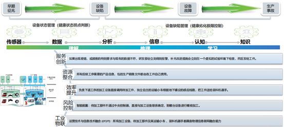 智能功能,是以工业互联网为基础,展现的是相关的风险控制、效率提升、资源整合,一直到服务创新。很多演讲嘉宾也提到了相关的数据要对应到智能制造的整个价值链,从传感器、数据、数据的分析到信息的融合,到最后的认知、知识库反馈重新的建模。最终,都是希望呼应到智能制造中的五大业务驱动力。以OEE设备综合效率为例,IBM希望把生产事故提前到设备故障、到设备缺陷这样一个层级。