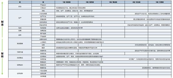 从管理体系出发是一种方式,另外从进程也是一种方式。工业企业信息化和工业化融合评估规范(GB/T 23030)与IBM智能制造进程评估,横跨从研发到业务创新十类维度,包含产品设计到协同制造共计二十六个领域,用成熟度指标来协助客户做智能制造成熟度的衡量,这种方式能够快速地定义中间的差距与相关计划。另外一种方式借鉴的是两化融合的评估规范23030的标准,企业也可以参考这样的标准进行评估。