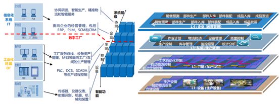 系统层级以数字工厂为核心,涉及智能制造系统层级的车间层、控制层、与设备层,也是信息化系统(IT)纵向整合工业化环境(OT),实现两化融合的重要基础。其中,工业化的环境是以数字工厂为核心,从上面车间的生产管理到下面的生产控制,再到最底层相关设备的互联互通。