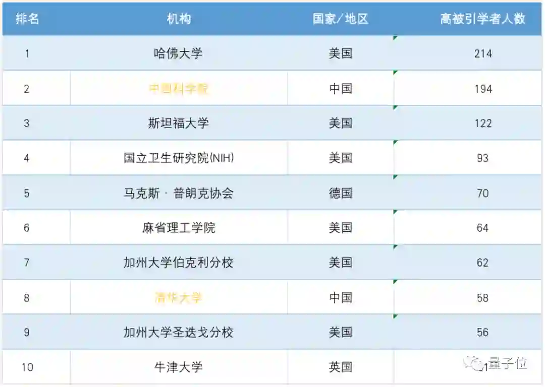 在全球高校&机构排名TOP 10中,中科院高被引学者人数位列第2,清华大学排到第8。