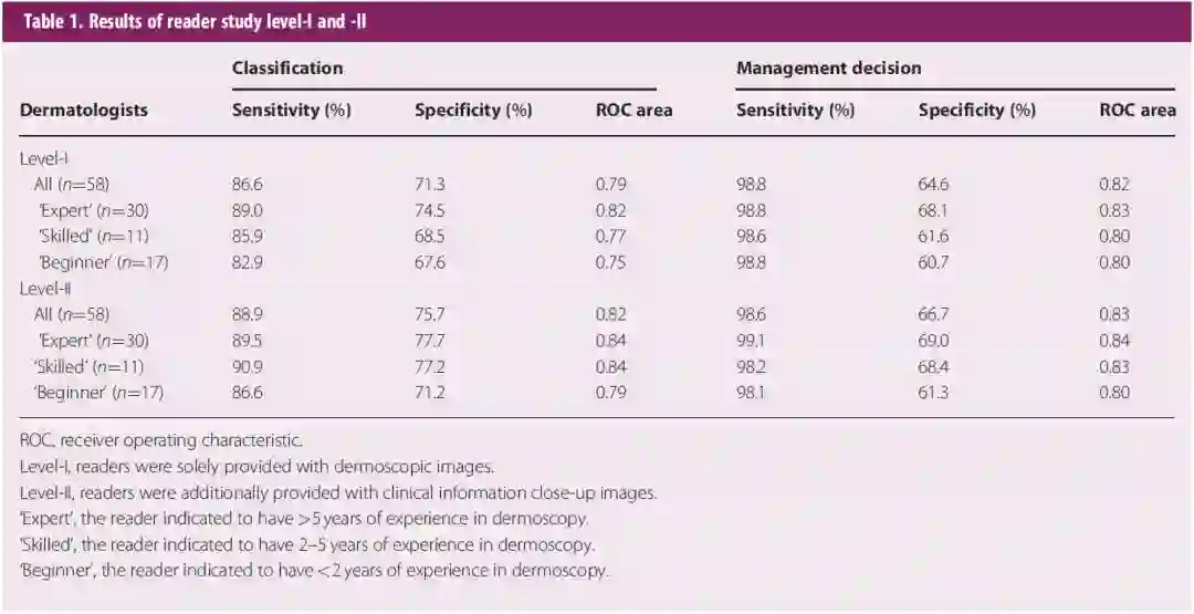 在 I 级诊断中,皮肤科医生对病变分类的敏感性和特异性的平均得分(±标准差)分别为 86.6% (±9.3%) 和 71.3% (±11.2%)。获得更多临床信息后(level-II),得分分别提升到了 88.9% (±9.6%, P = 0.19) 和 75.7% (±11.7%, P < 0.05)。相比于皮肤科医生在 I 级、 II 级的特异性与敏感性得分,CNN 的 ROC 曲线显示出更好的特异性(82.5%)。CNN 的 ROC 曲线下面积要比皮肤科医生的平均 ROC 面积(0.86 vs 0.79, P < 0.01)大。CNN 的得分接近 ISBI 2016 挑战赛的 3 大顶级算法结果。