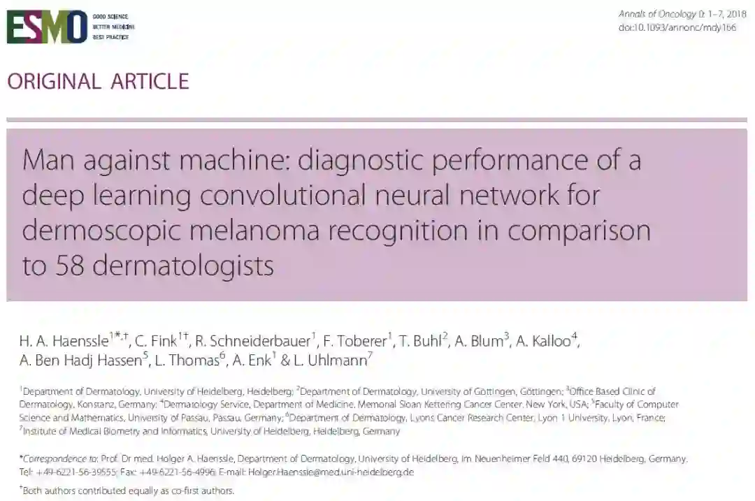 今日,一篇关于皮肤癌诊断的文章发表在医疗期刊《肿瘤学年鉴》(Annals of Oncology)上,这篇出自医疗界高级管理医师的研究首次表明:深度学习卷积神经网络(CNN)在检测皮肤癌方面的表现优于有经验的皮肤科医生。对比对象是来自 17 个国家的 58 位皮肤科医生,其中包括 30 位专家。