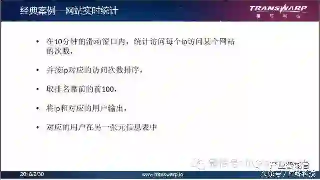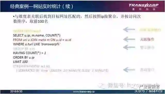 最后因为时间关系,我们就不详细介绍剩下两个案例。第三个是网站实时统计的一个场景,需求我列在ppt里,其实我们也只需要下面这张ppt里的几行SQL就可以解决。