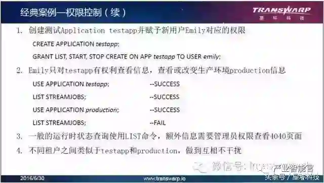 具体来说是这样的,首先要去创建一个testapp,就是create application testapp,然后把相应的权限都赋给Emily。这样做了之后,一般来说到对应的testapp里去查相应的权限是可以查到Emily有权限的,但是她到另外一个生产集群上去做相应的操作,是没办法成功的。另外,我们的List命令是可以查询到一般的运行状态的,比如现在跑了多少task,运行了多长时间,在什么状态,有没有什么问题等等。额外的信息我们是不给普通权限的人开放的,需要有管理员信息才可以到4040页面查看。最后,不同租户之间,例如刚才的testapp和production之间做到彻底隔离互不干扰。