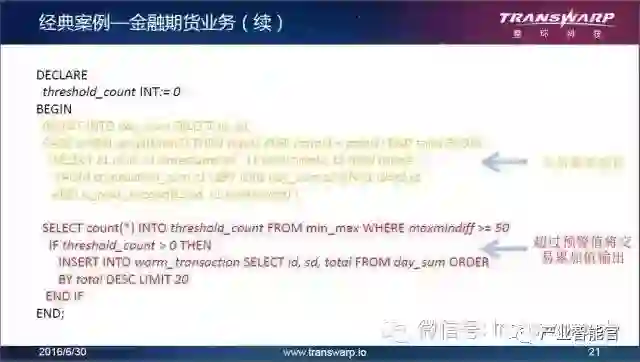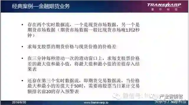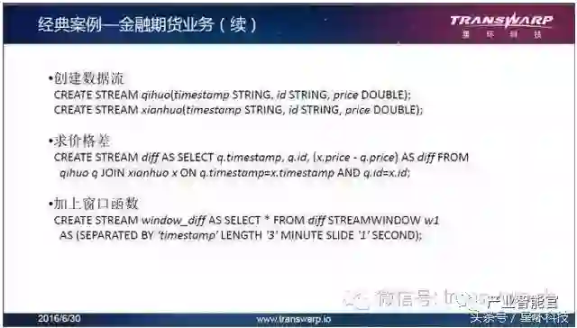 最后一个案例是比较复杂的金融期货的案例。简单来说,整个过程就和刚才差不多,就不断的create一些stream表,不停的在stream表上做一些转化,再加上一些窗口函数,最后就可以实现一些很复杂的业务。