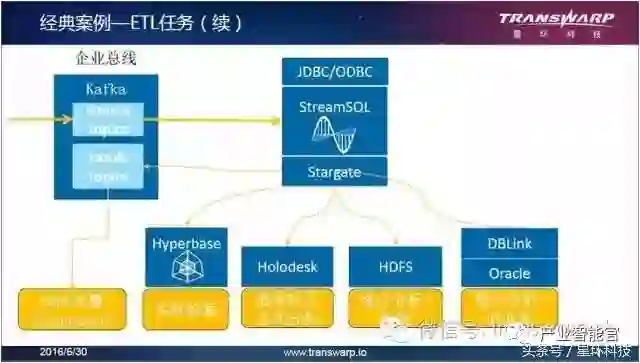 如果有一些实时数据进来,我可能有需求要把他们存储起来,录入到某个库里面,或者后来需要做现场分析,我们要录入holodesk内存表,之后做查询。这就是一个非常常见的ETL任务,无论在什么行业里,当前这个用到的是比较多的。若这个步骤要用编程实现,工作量还是蛮大的,有很多问题需要考虑,接口怎么处理等等。如果是用我们的产品,你可以用过JDBC或者ODBC对接我们的StreamSQL,通过Stargate导到各个不同的数据库里,比如对Hyperbase做一个实时的检索,Holodesk可以做实时的交互分析,HDFS可以做统计分析和跑批等等。我们甚至可以把结果在写回Kafka,给下一个应用做实时告警。