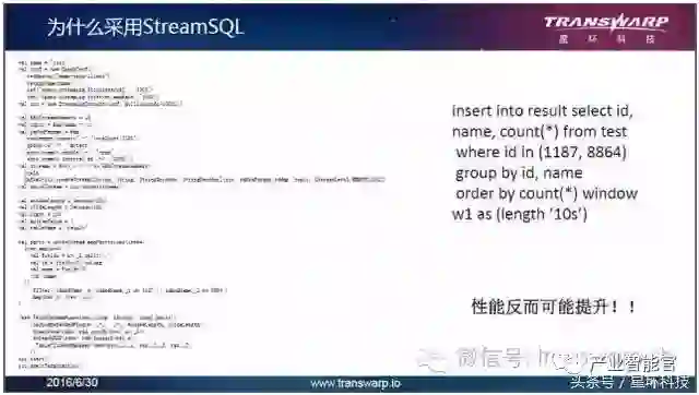 接下来有一个非常直观的例子。左边这部分是用spark streaming 写的代码,这里还不是完整版,完整的需要2页ppt才能展示。如果用SQL写,就只需要右边的这几行代码了。这几行主要就是对test表根据一定的排列方式输出查询结果。这个SQL看上去就比较直观,稍微有点SQL经验的人都可以容易的看懂这些代码。如果让分析人员看左边的代码,那就比较困难了。