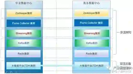 流处理平台使用的主要技术组件及其在两个数据中心部署的架构如上图所示。其中:Zookeeper集群,主要负责配置流处理平台管理和任务队列管理功能;Flume Collector集群,主要负责流处理平台文件类数据的接入工作;Streaming集群,为流处理平台的核心组件集群,主要负责数据流处理功能;Kafka集群,主要负责消息订阅与消息传输缓存功能;Redis集群,主要负责消息订阅,数据分析及数据查询功能;大数据平台集群,主要负责数据的存储、同步和数据分析挖掘等功能。