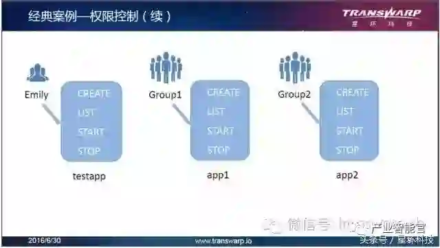 第一个是有关于权限控制。团队来了新人,想基于生产集群的数据额外开发一些新的功能,这时候就需要比较高效的开发。或者现在有用户想查看某些信息,但是一些敏感信息只有管理员才能看到。另外,公司里的多租户环境中,多个租户同时在同一台机器上运行程序,不会相互干扰。对于以上问题,我们抽象出了一个Application的概念,例如图中这个新用户叫做Emily,刚进公司把她归在一个testapp里面,你可以赋予她各种权限。比如她有权利在testapp里创建流应用,她有权利去看当前正在运行的分析系统,她有权利去启动一些以前存储过的存储过程。类似的,公司里可能还有一群人group1,对应他们有一个应用叫app1。如果现在Emily想去看group1的app1里的东西,不给她赋予一个特殊的权限,她是没办法看到的,所以我们就做到了一个这样的隔离。