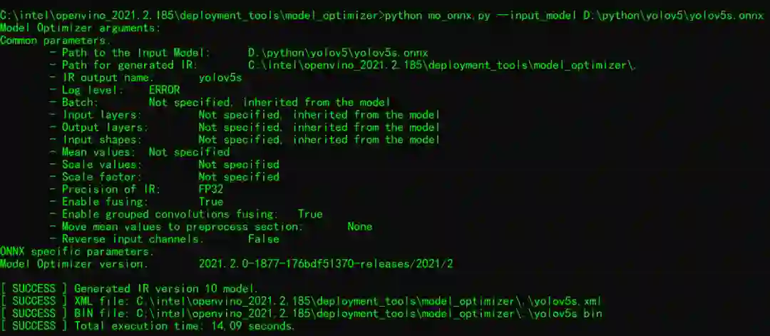 模型转换主要是把原始的YOLOv5的pytorch模型文件转换为通用的开放模型格式ONNX与OpenVIN特有的文件格式IR(*.xml与*.bin)。
