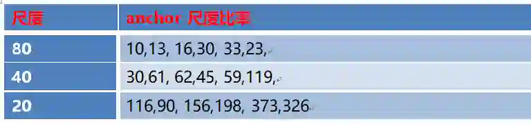 以输入640x640大小的图像为例,得到三个输出层大小应该分别是20、40、80。每个层上对应三个尺度的anchor,表示如下: