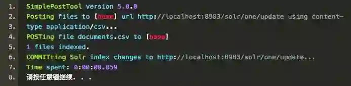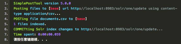 代表着id从1到5共五个文档,接下来复制solr-5.2.1\example\exampledocs下的上传工具post.jar到resources目录,利用如下命令行将数据导入:
