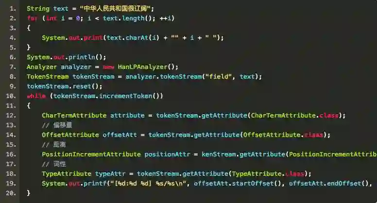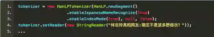 在另一些场景,支持以自定义的分词器(比如开启了命名实体识别的分词器、繁体中文分词器、CRF分词器等)构造HanLPTokenizer,比如: