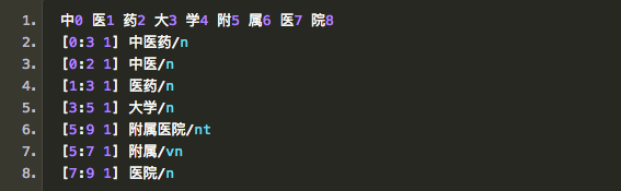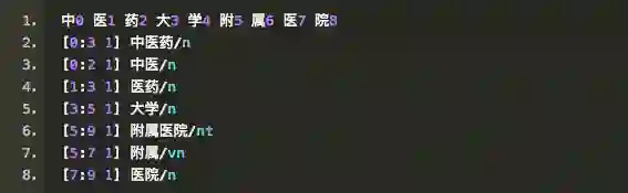索引模式可以对长词进行全切分,得到其中蕴含的所有词汇。比如“中医药大学附属医院”在HanLP索引分词模式下的切分结果为: