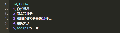 修改好了,就可以拿一些测试文档来试试效果了。hanlp-solr-plugin代码库中的src/test/resources下有个测试文档集合documents.csv,其内容如下: