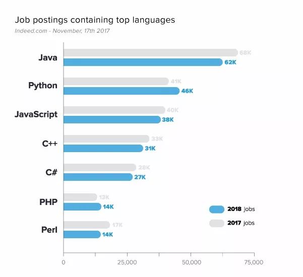 近日,Coding Dojo 分析了来自Indeed.com求职网站上的二十五种编程语言,栈和框架,分析得出2018年最具前景的7门编码语言。